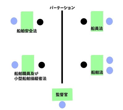 船舶法のみ試験官が2名でしたが、その他の試験官は1名。その他に部屋全体が見渡せる場所に監督官が1名いました。