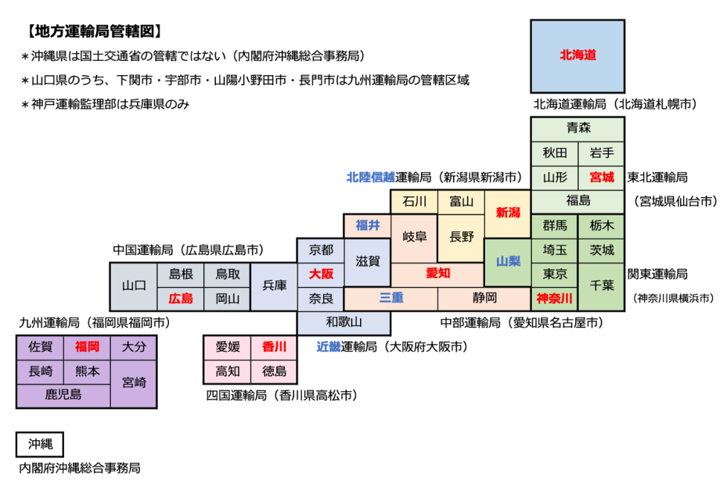 注意!兵庫県は「神戸運輸監理部」・沖縄県は「内閣府沖縄総合事務所」が管轄になります。