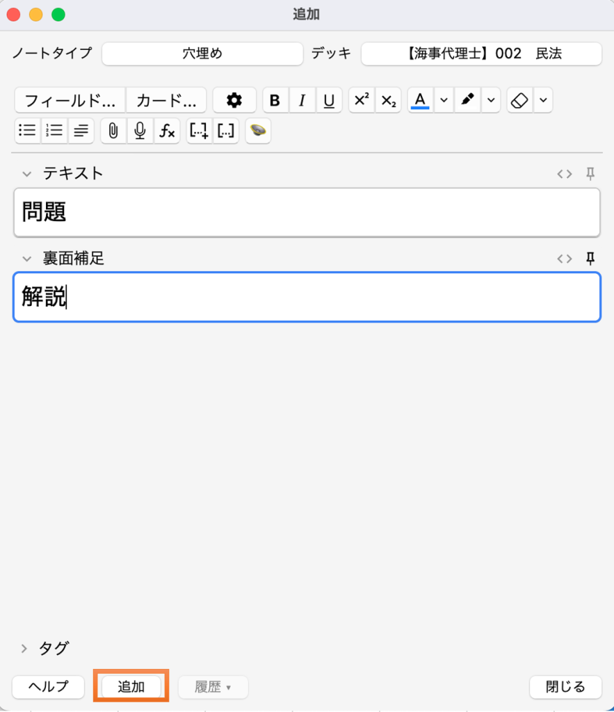 作成したデッキを選択して、上にある「追加」をクリックすると作成画面になります。
